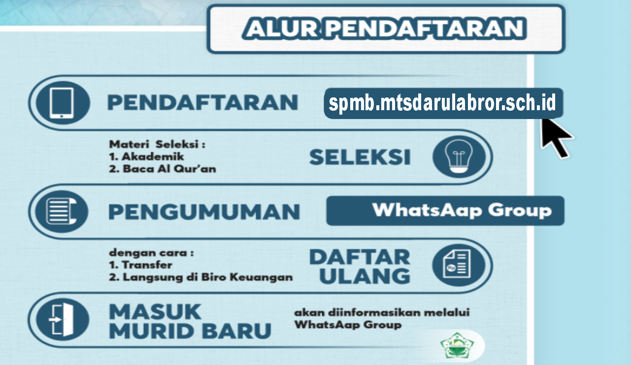 MTs Darul Abror Kedungjati menyediakan SPMB secara online dan diharapkan proses SPMB dapat berjalan cepat dan bisa dilakukan dimanapun dan kapanpun selama sesi SPMB Online dibuka dengan cara mengakses website SPMB Online MTs Darul Abror Kedungjati.